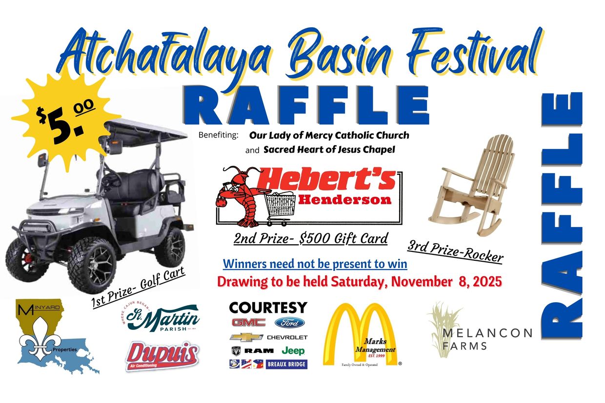 Drawing will be held at the Atchafalaya Basin Festival on Saturday, November 8, 2025. Winners need not present to win.